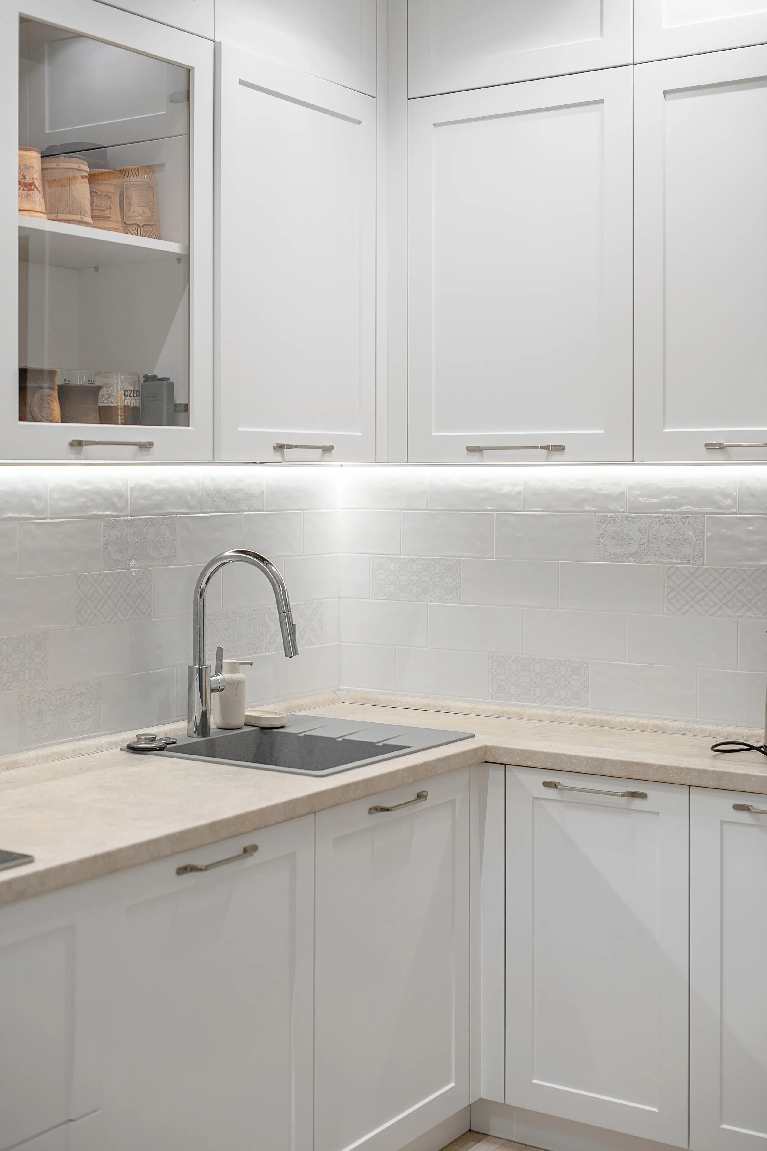 Кухня угловая белая в стиле неоклассика (современная классика).