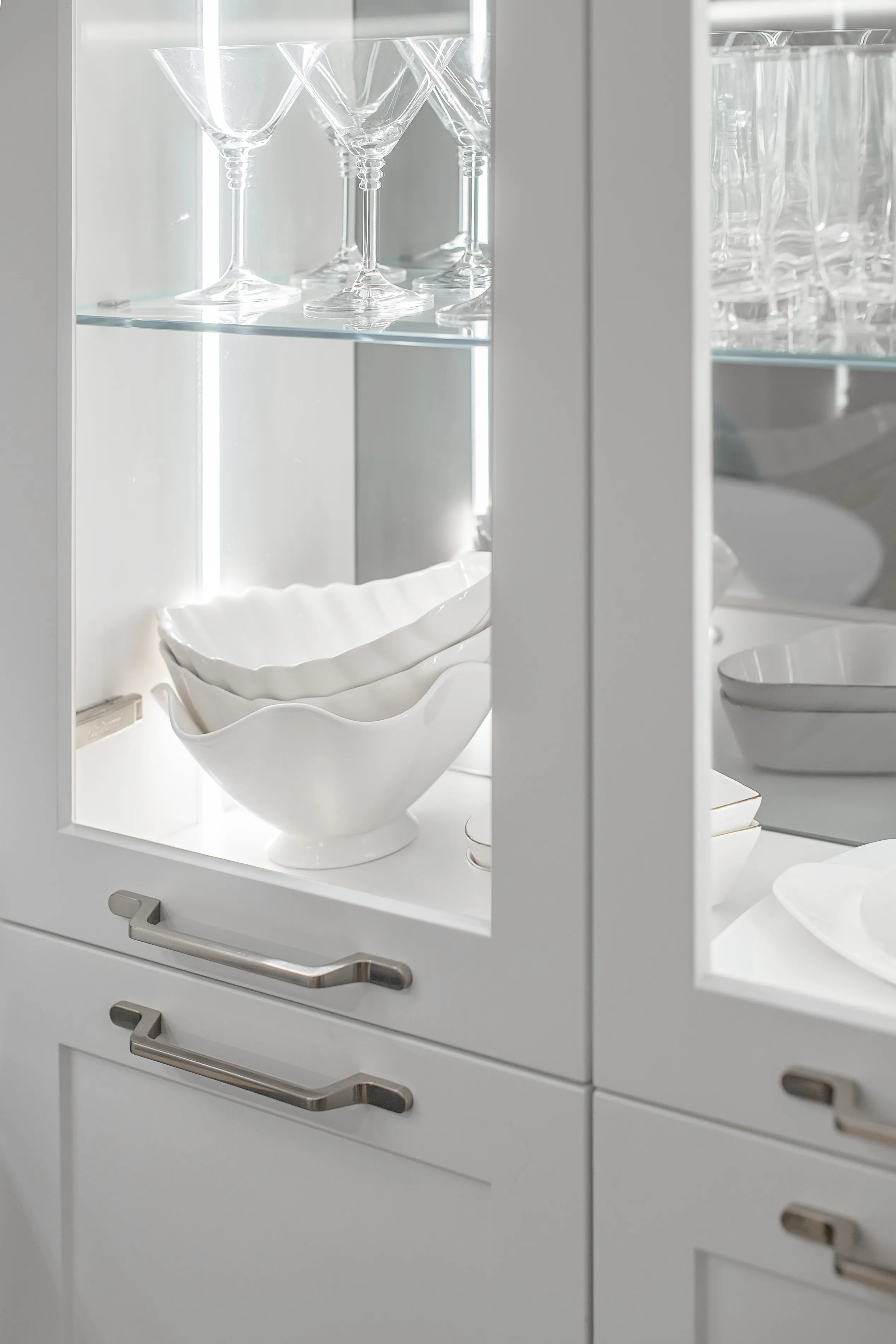Стекло в витринах осветлённое. Шкафчики вешаются на скрытые завесы, чтобы за стеклом не было видно креплений.