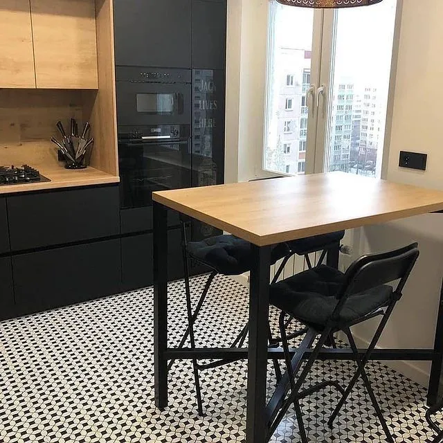 Кухня в чёрном цвете. Пример отличного сочетания дерева и чёрных матовых фасадов.
