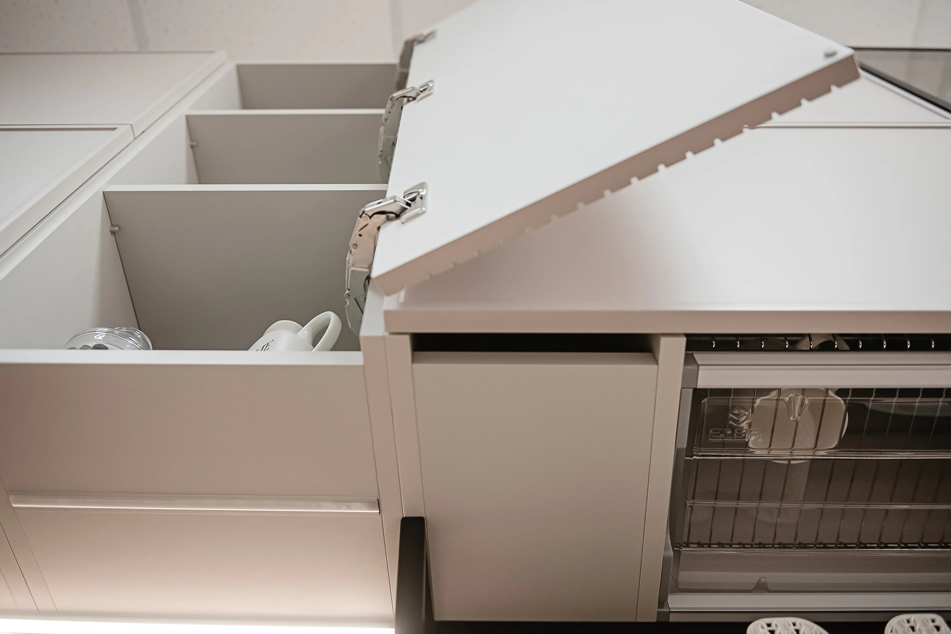 Фасады изготовлены из фрезерованного крашеного МДФ в цвете кашемир.