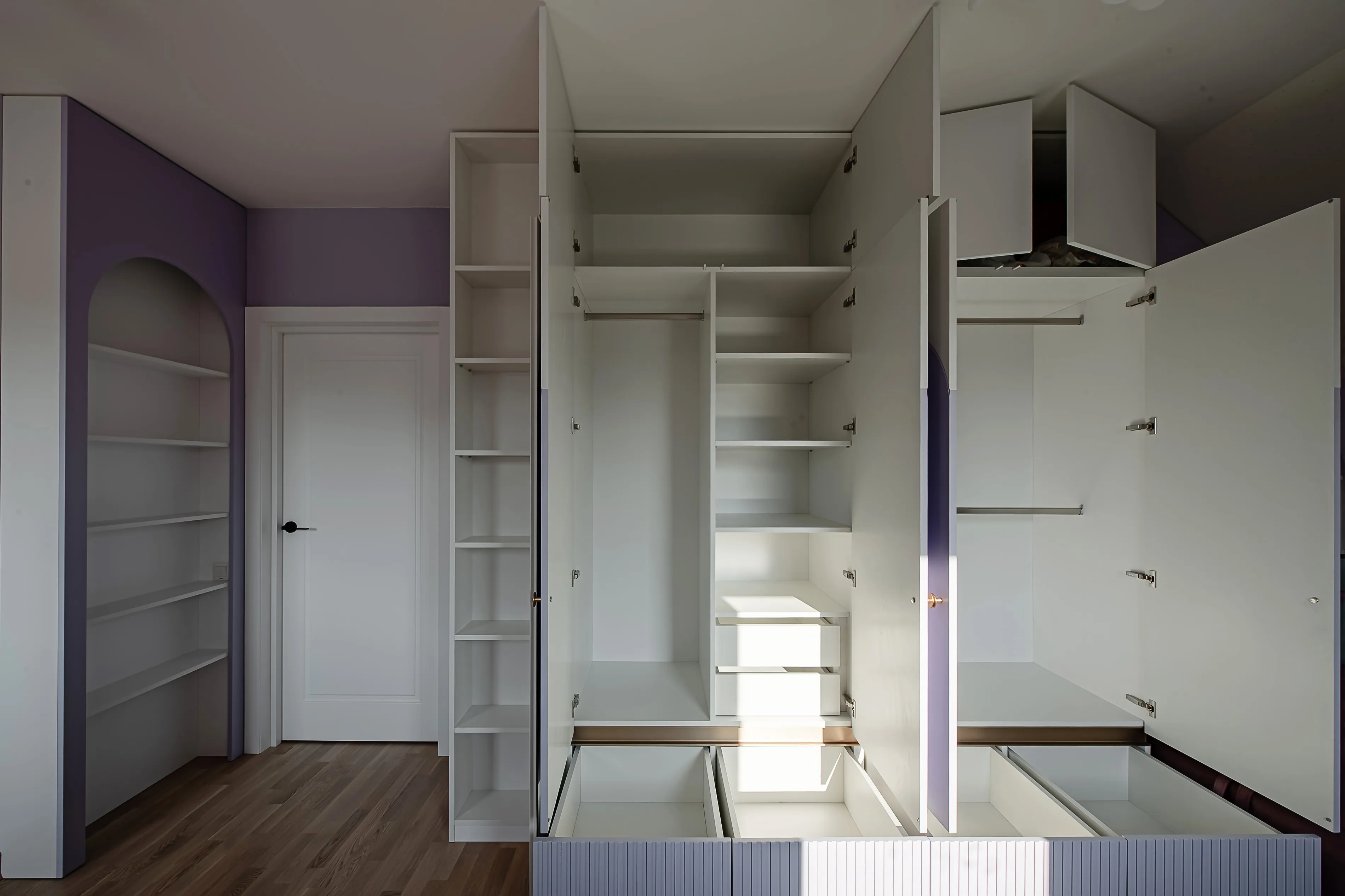 Комплект мебели в лавандовом цвете в комнату девочек в частном доме.