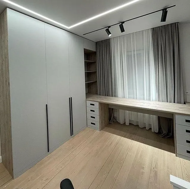 Мебель для детской: рабочая зона возле окна и шкафы сделаны из ЛДСП Egger.