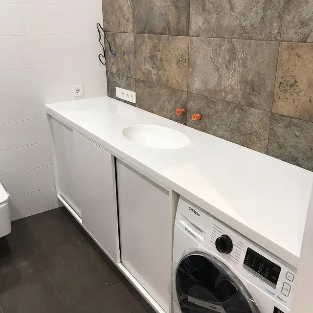 Тумба с раздвижными дверями в ванную комнату. Столешница акриловая с интегрированной раковиной.