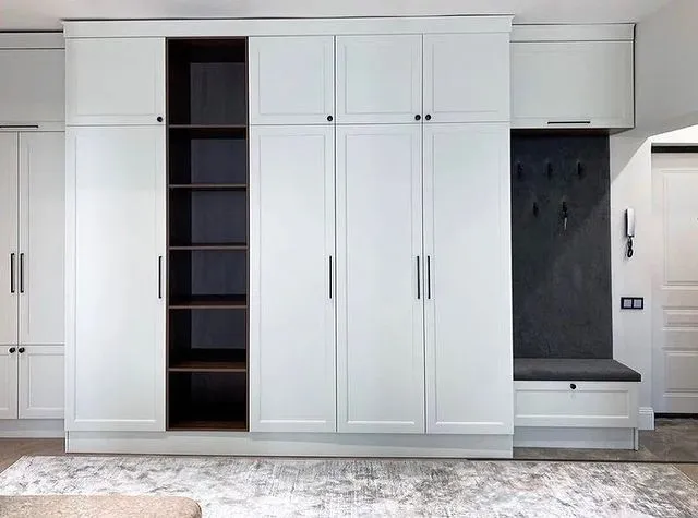 Прихожая в классическом стиле белого цвета. Фасады выполнены из фрезерованного крашеного МД.